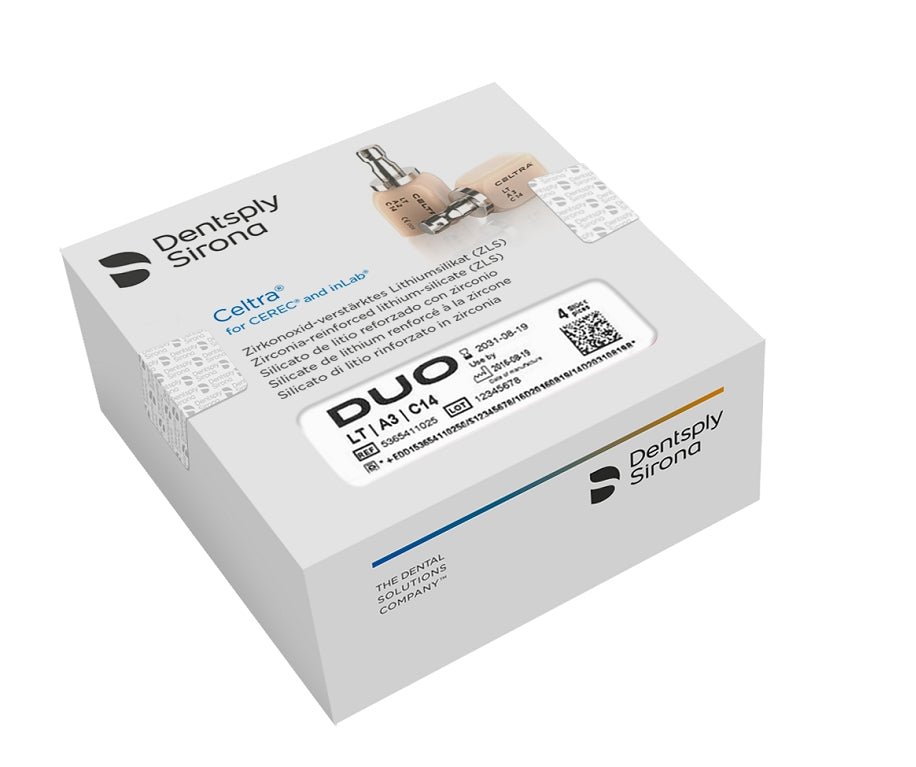 CELTRA DUO Il nuovo DNA della vetroceramica ad alta resistenza. CELTRA DUO blocchetti giÓ cristallizzati in colorazione dentinale, fresabili con tecnologia CEREC di Sirona. Il nuovo silicato di litio rinforzato con zirconia (ZLS) dalle proprietÓ uniche frutto della sua microstruttura: laggiunta del 10% di zirconia consente, infatti, una presenza di cristalli di silicato di litio ultra-fini che coniugano unelevata resistenza alla flessione con unestetica straordinaria e tempi ridotti di lavorazione. CELTRA DUO permette al professionista due opzioni di utilizzo: - immediatamente cementabile nel cavo orale del paziente, dopo la fresatura e lucidatura, grazie alla resistenza di 210 MPa, doppia rispetto alle ceramiche vetrose convenzionali. - Utilizzabile dopo la caratterizzazione con Stains e successiva glasura, con una resistenza di 370 MPa, per risultati estetici ottimali. CELTRA DUO Ú disponibile in blocchetti di 8 colori (tinta VITA), in versione normale (LT) o ad elevata traslucenza (HT), con colori per caratterizzazione con CELTRA STAINS. Lutilizzo in combinazione con il CELTRA Cementation kit assicura una cementazione affidabile e di lunga durata. La zirconia dispersa nella fase vetrosa, senza opacizzare il vetro, ne rafforza la matrice. In combinazione con la presenza dei cristalli di silicato di litio, garantisce una resistenza molto elevata (fino a 420 MPa). Celtra Duo Blocchetti confezione da 4 pezzi - Misura C14 - colore A2 - LT.