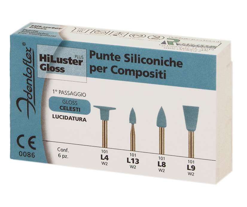 HI-LUSTER Gommini siliconici per la lucidatura dei compositi (1° passaggio) montati su gambo RA. Forma a fiamma per la lucidatura di solchi e fessure di restauri in composito. Confezione da 6 pezzi. Colore celeste, gambo dorato. Per l'utilizzo in combinazione con i gommini della gamma HiLuster DIA (2° passaggio - grigi).
