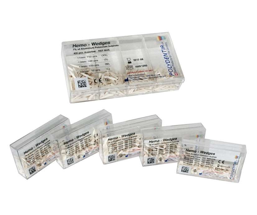 HEMO-WEDGES Cunei interdentali in legno d'acero con effetto emostatico che contengono alluminio potassio solfato, sostanza riconosciuta per il suo effetto astringente sulle gengive. Dotati di forma anatomica e punta ricurva garantiscono punti di contatto perfetti, evitando il ferimento della papilla gengivale. Colorazione neutra, disponibili in 5 misure. Hemo-Wedges 100 cunei emostatici 15 mm L