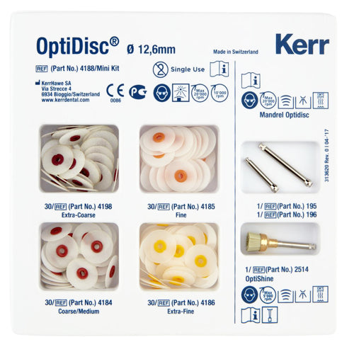 Mini Kit: ø 12,6 mm: 30x extra coarse, 30x coarse/medium, 30x fi ne, 30x extra fi ne, 3x mandrino standard, 2x mandrino corto, 1x OptiShine.