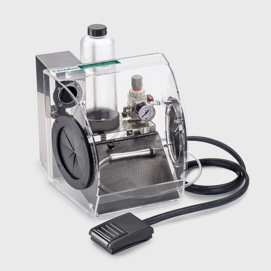 BOX in metacrilato trasparente con aperture laterali per il passaggio delle mani e degli oggetti da lavorare, griglia di separazione dei detriti e schermo asportabile per facile sostituzione + MODULO microsabbiatrice per erogare ossido di alluminio, con gruppo di trattamento aria (filtro, riduttore e manometro), comando a pedale e manipolo ergonomico con ugello di precisione + Sistema di ASPIRAZIONE pneumatico per l’evacuazione costante del particolato polveroso, prodotto durante il trattamento e un sacchetto filtro, in panno microfiltrante.