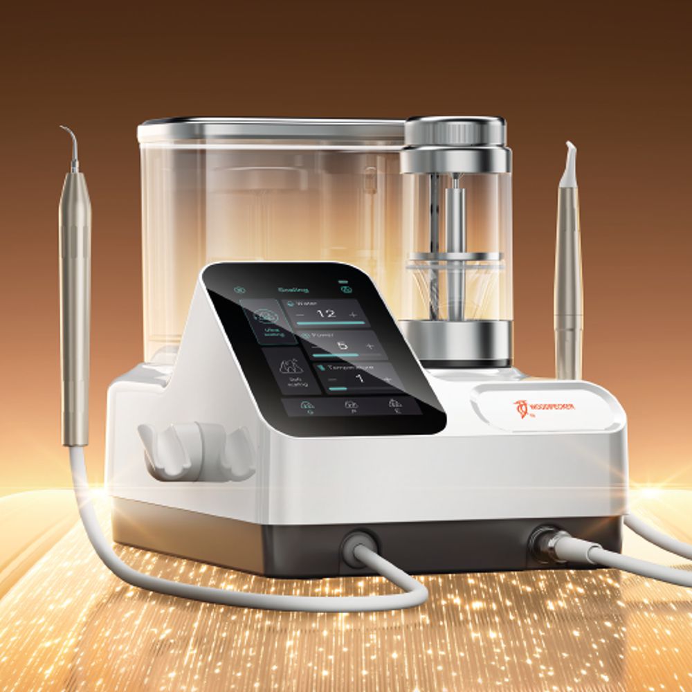 Dental scaler + Air polisher. Doppo sistema di riscaldamento. Manipoli in lega di titanio, leggeri e resistenti. 6 modalità ad ultrasuoni. Serbatoio polvere illuminato. Pedaliera multifunzione. Completo di 2 manipoli LED + 22 inserti. Completo di manipolo sopragengivale + manipolo sottogengivale. Valigia per trasporto.