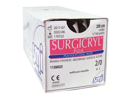 Suture in acido poliglicolico, multifilamento intrecciato e rivestito, colore viola.